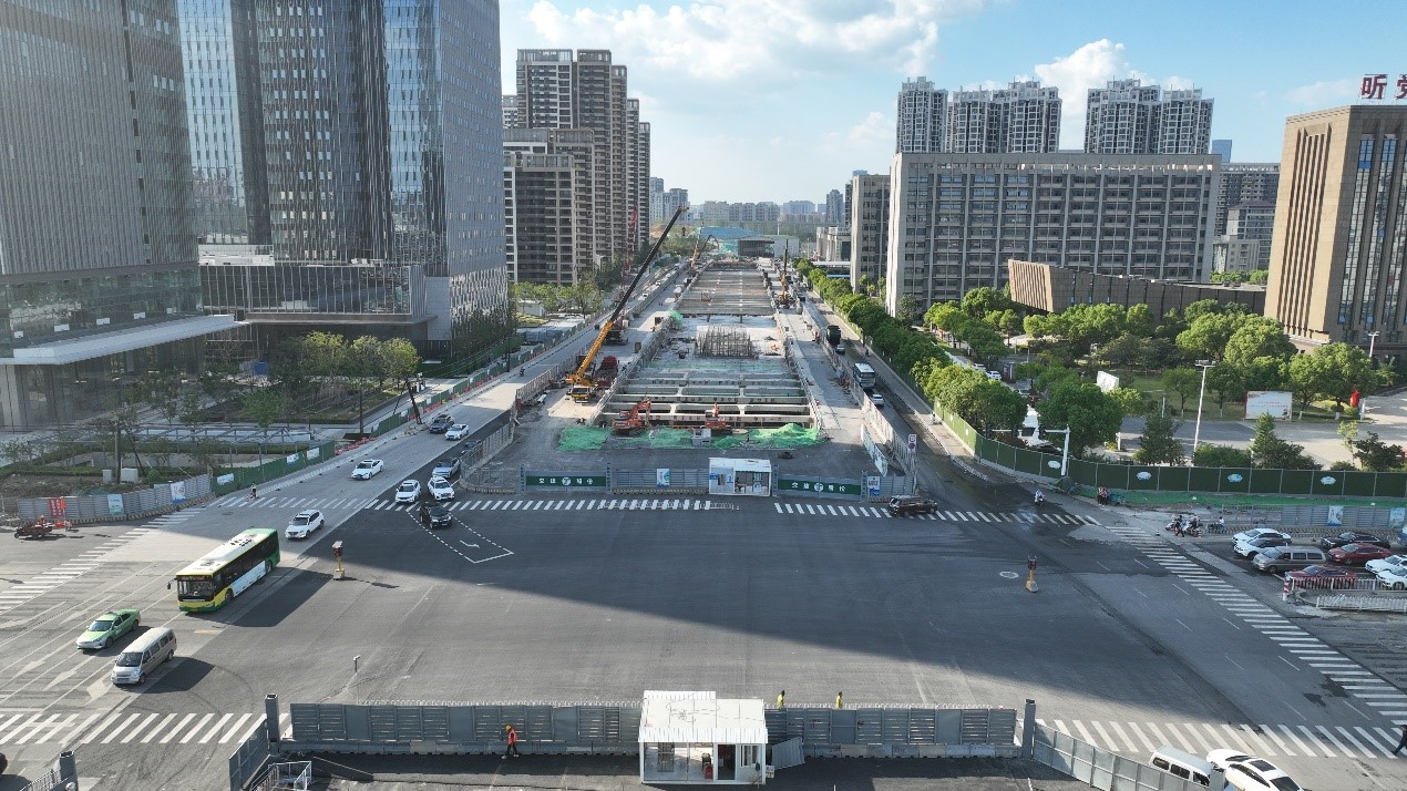 宿松路与繁华大道双层下穿叠合段长32m、宽34m,开挖深度17m,自4月19日垫层浇筑以来,项目办组织各参建单位通过BIM+GIS技术优化现场空间布置及施工时序安排,克服了作业空间狭小、支撑密集且换撑复杂、土方开挖量大、多工序交叉作业等不利条件,历时135天完成垫层→防水、底板、侧墙及中墙→换撑→中板、顶板→拆撑→回填、道路结构层等全部工序,按计划节点时间成功实现交通导改。